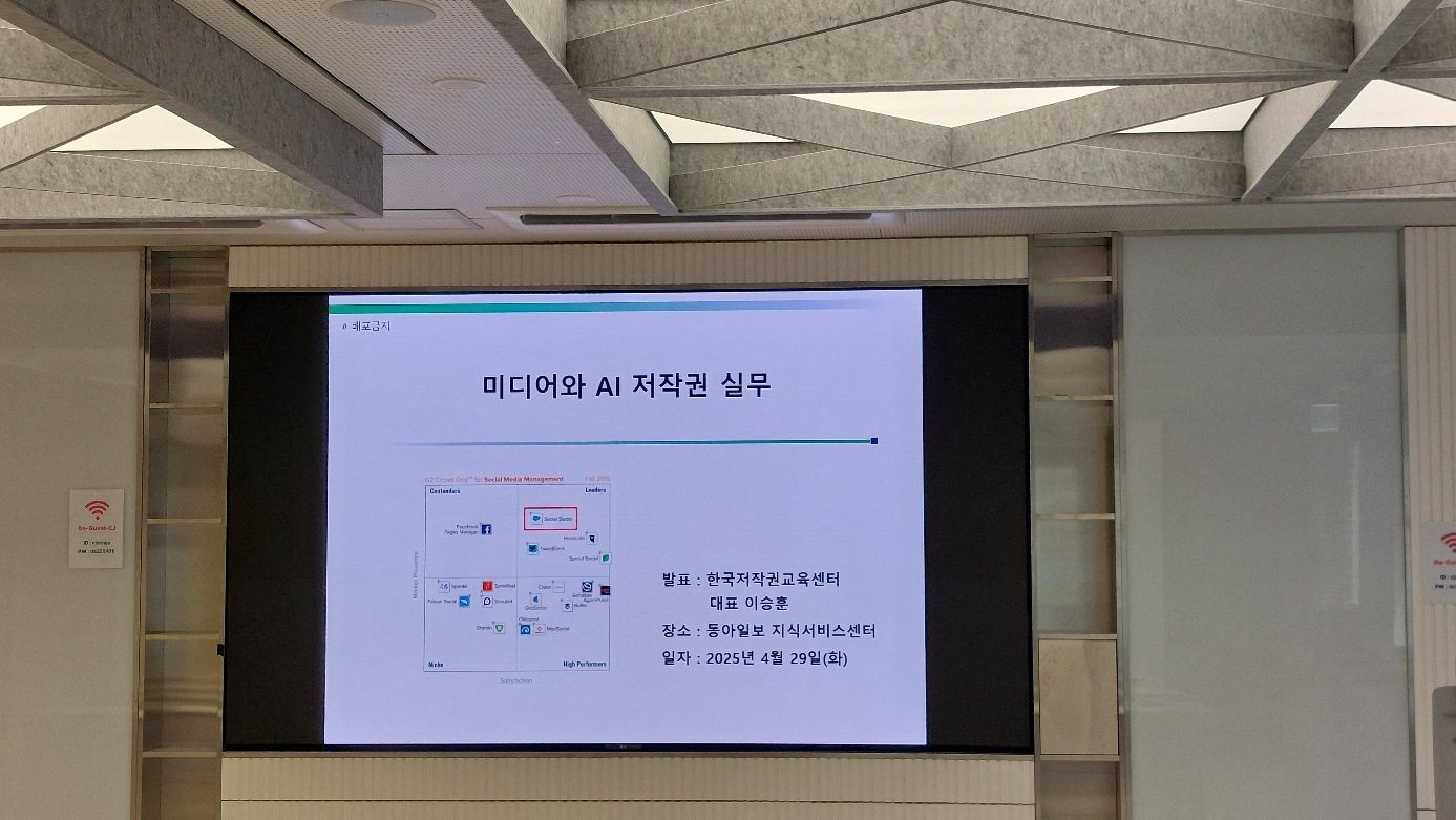 동아일보 지식서비스센터 초청 저작권 심화과정 특강을 진행했습니다. 이번 트강은 지난 4월 '지식서비스와 관련된 저작권' 강의에서 보다 심화된 내용을 다루었습니다. 인공지능이 생성한 결과물에 관한 저작권 이슈를 심층적으로 다루었습니다. 또한 ai 콘텐츠 관련 이슈들을 정리하며 비즈니스에 접목되는 모델들에 관하여 깊게 설명하였습니다.