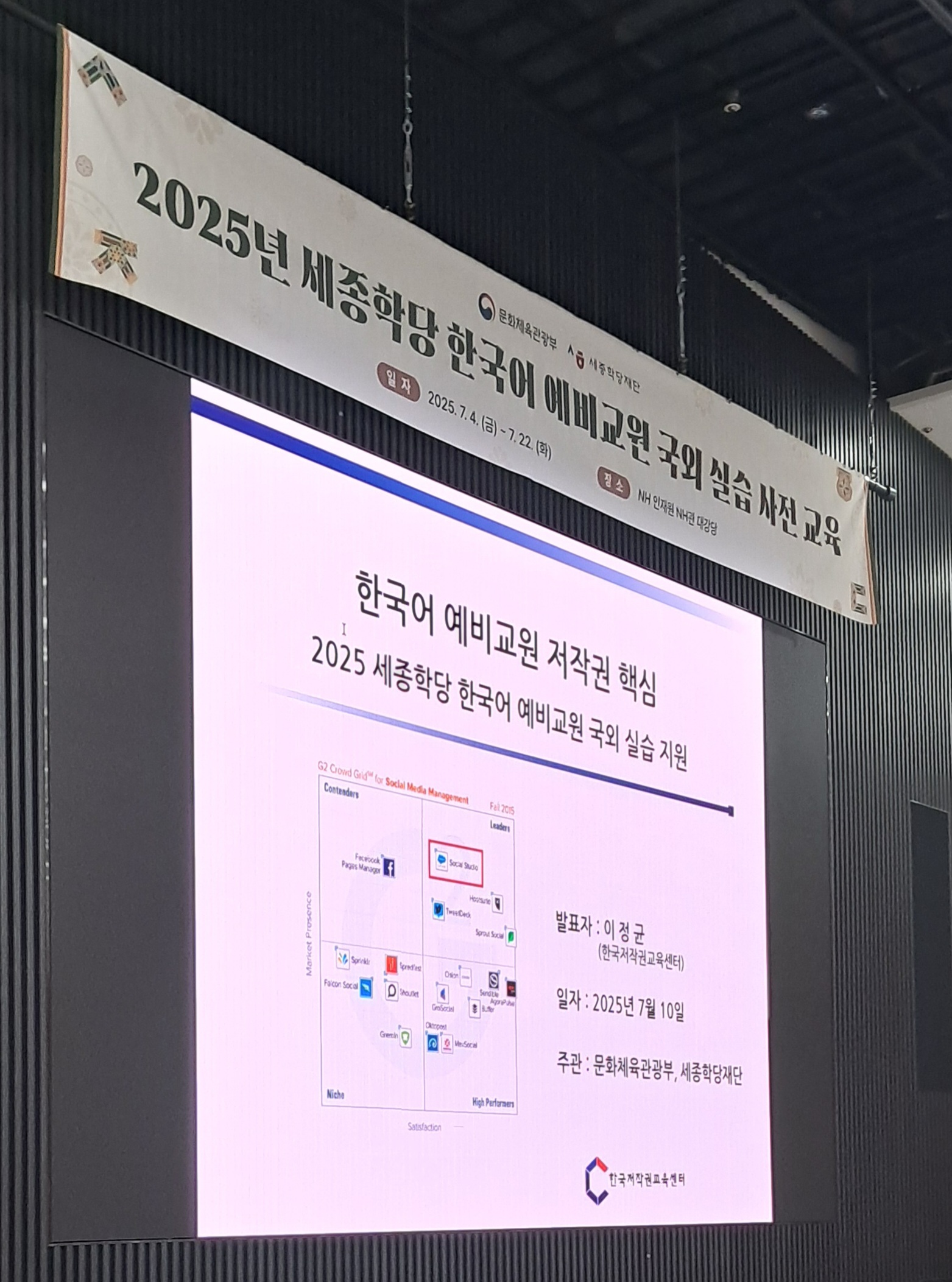세종학당 수강생 대상으로 저작권 특강 진행하였습니다. 한국어 예비교원 과정에 참여하고 있는 분들을 대상으로 국외 실습을 위한 사전 교육 프로그램에서 한국어 교재 제작, 강의자료 준비를 할 때 알아야 할 저작권 지식이 관하여 설명하였습니다.